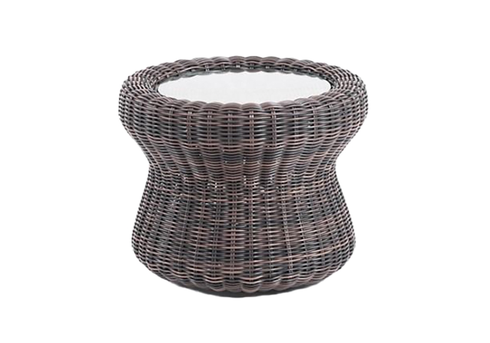 Agorà produit et signé par Unopiù est une table basse circulaire avec structure en aluminium et coque en fibre synthétique waprolace tissée à la main. Le dessus est en verre. Agorà est disponible en différentes tailles.