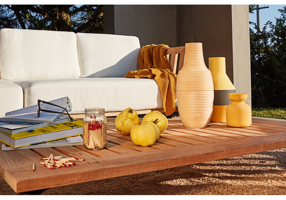 Welcome conçue et produite par Unopiù est une table basse d'extérieur quadrangulaire avec plateau en teck et pieds en aluminium. Welcome est disponible en différents modèles.