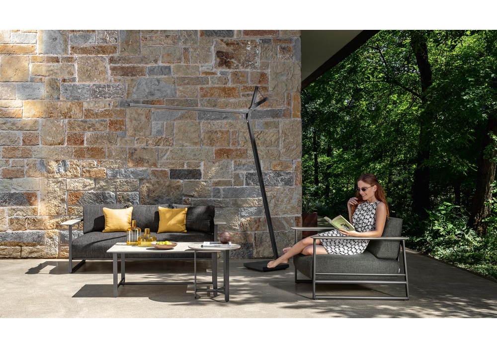 Riviera conçue par Jean Philippe Nuel pour Talenti est une collection de tables basses d'extérieur composée d'une base en aluminium et d'un plateau en grès.