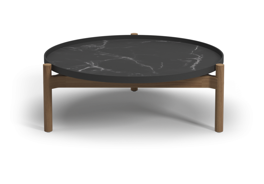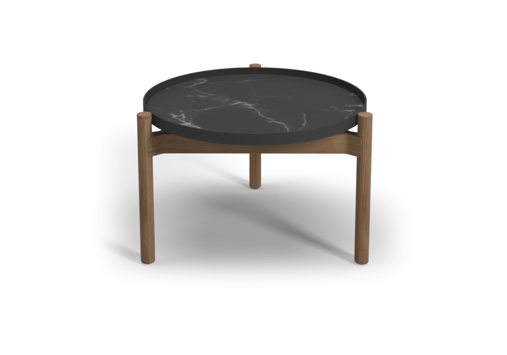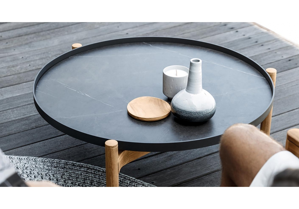 Sepal conçue par Mark Gabbertas pour Gloster est une table d'appoint d'extérieur composée d'une structure en teck au fini naturel et d'un plateau en céramique avec rebord en aluminium enduit de poudre.