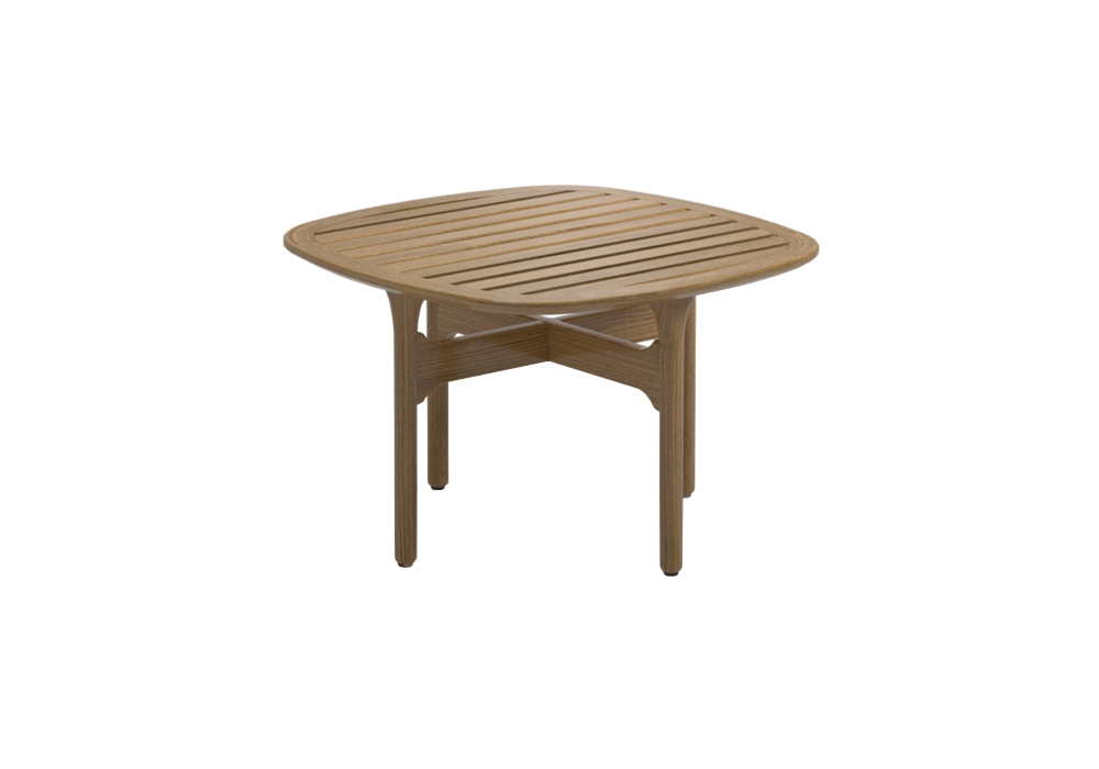 Bay conçue par Henrik Pedersen pour Gloster est une table d'appoint d'extérieur composée d'une structure en teck et d'un plateau à lattes en teck.