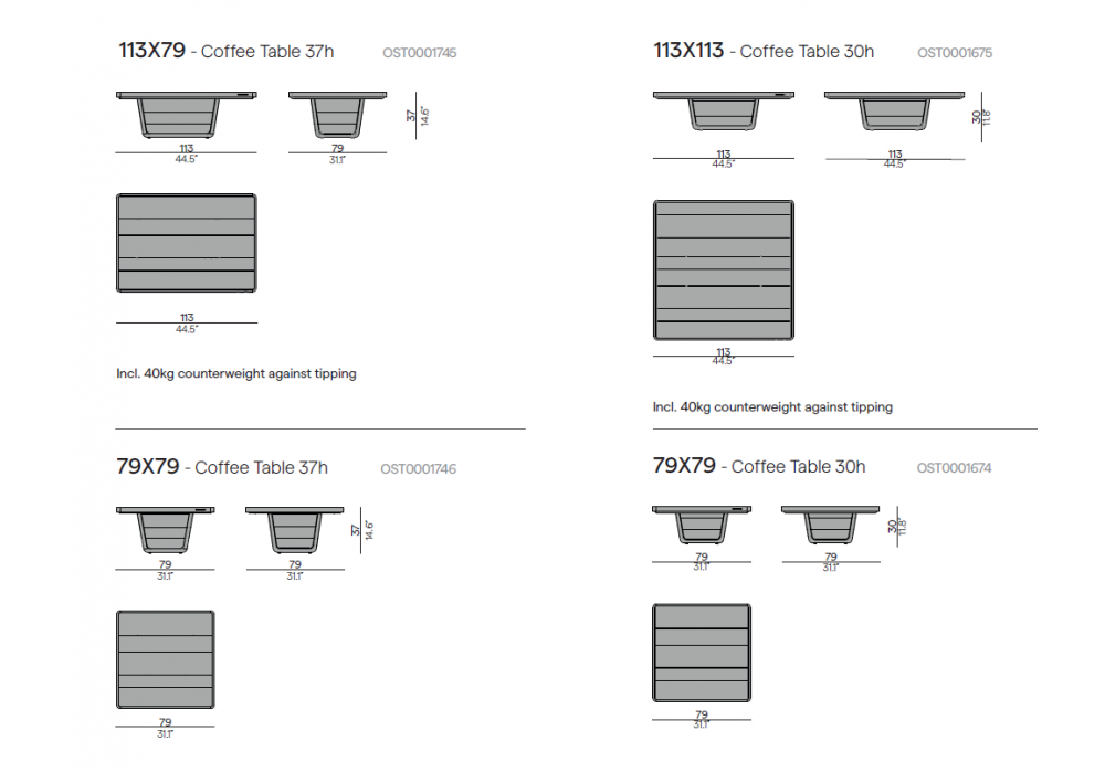 | Dimensions | - 113 x 113 x H 30 cm; - 79 x 79 x H 30 cm; - 113 x 79 x H 37 cm; - 79 x 79 x H 37 cm. |