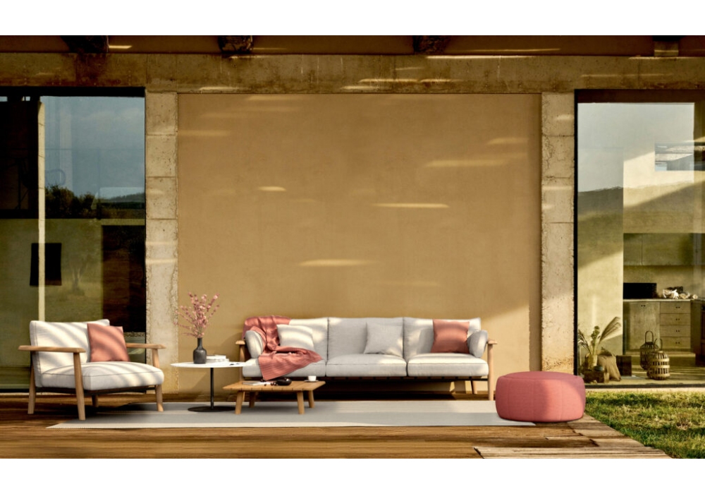 Mambo Lounge conçue par Kris Van Puyvelde pour Royal Botania est une table basse d'extérieur avec structure en teck et plateau en différentes finitions et matériaux.