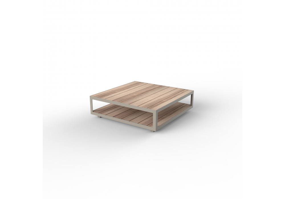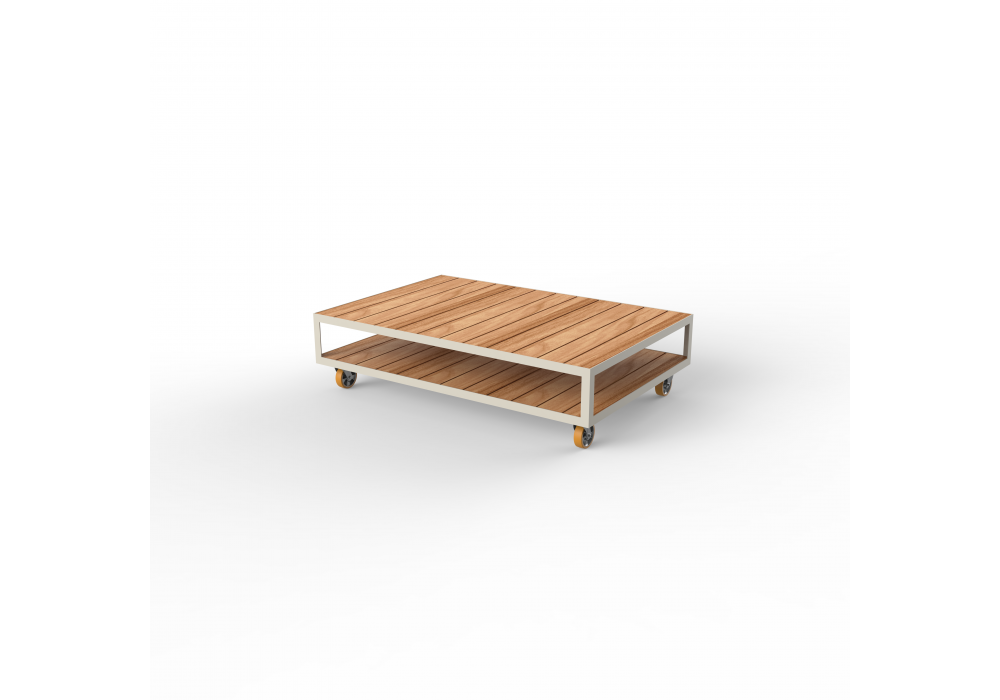 Vineyard conçue par Ramón Esteve pour Vondom est une table basse réalisée avec une structure en aluminium et des plateaux en bois. Disponible avec roues ou avec pieds.