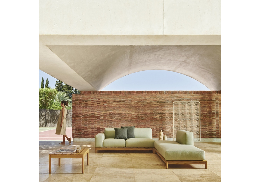 Barcode conçue par Alessandro Dubini pour Varaschin est une table basse avec structure en teck de plantation certifié. Disponible en deux tailles.