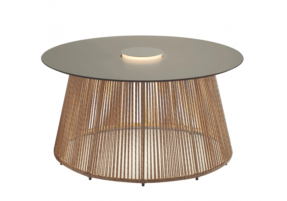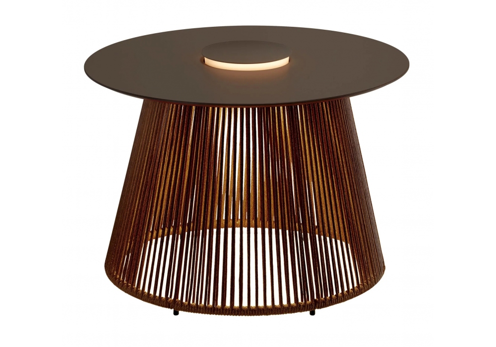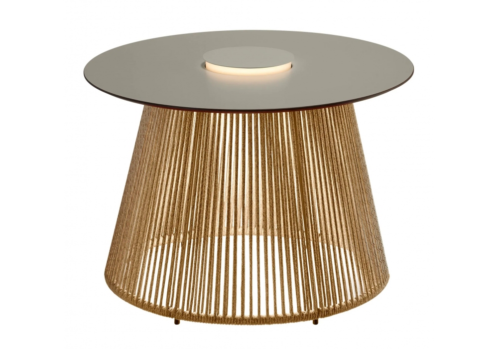 Nit conçue par Gonzalo Milà pour Bover est une table basse d'extérieur avec lumière LED intégrée. Le plateau est en HPL tandis que la structure porteuse est en aluminium recouverte de corde nautique ou synthétique. Le diffuseur est en polycarbonate et protège une source de lumière LED avec interrupteur marche/arrêt à trois intensités. Nit est disponible en différents modèles et finitions.