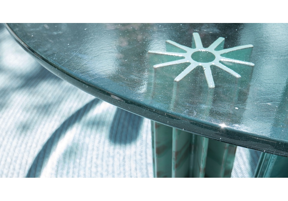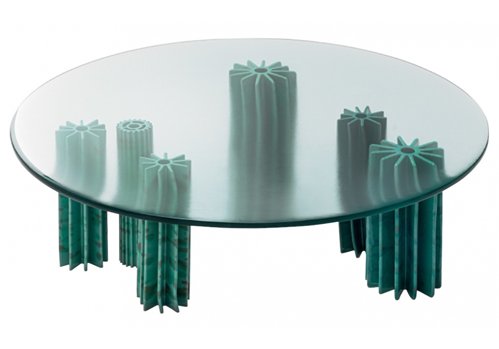 Helico conçue par Nicolò Morales pour Paola Lenti est une table basse avec une base composée d'éléments en faïence extrudée réalisés et décorés à la main. Les éléments, de différentes formes et tailles, ont un noyau en acier inoxydable peint mat.
