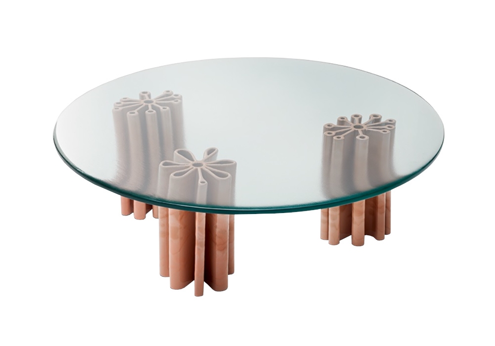 Primula conçue par Nicolò Morales pour Paola Lenti est une table basse avec une base composée d'éléments en faïence extrudée, réalisés et décorés à la main. Plateau en fusion de verre transparent. Disponible en différentes tailles. Convient pour l'extérieur.