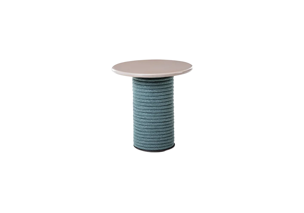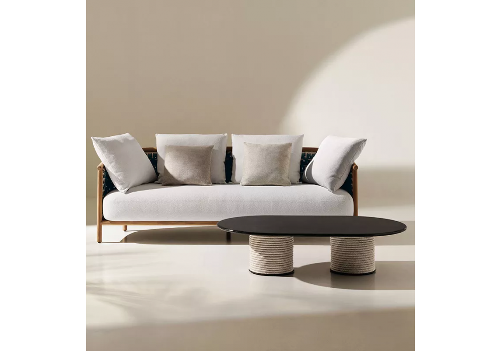 Patio conçue par Zanellato / Bortotto pour Ethimo est une table basse avec un piètement en aluminium recouvert d'une corde tressée plate. Piano en pierre de lave émaillée.