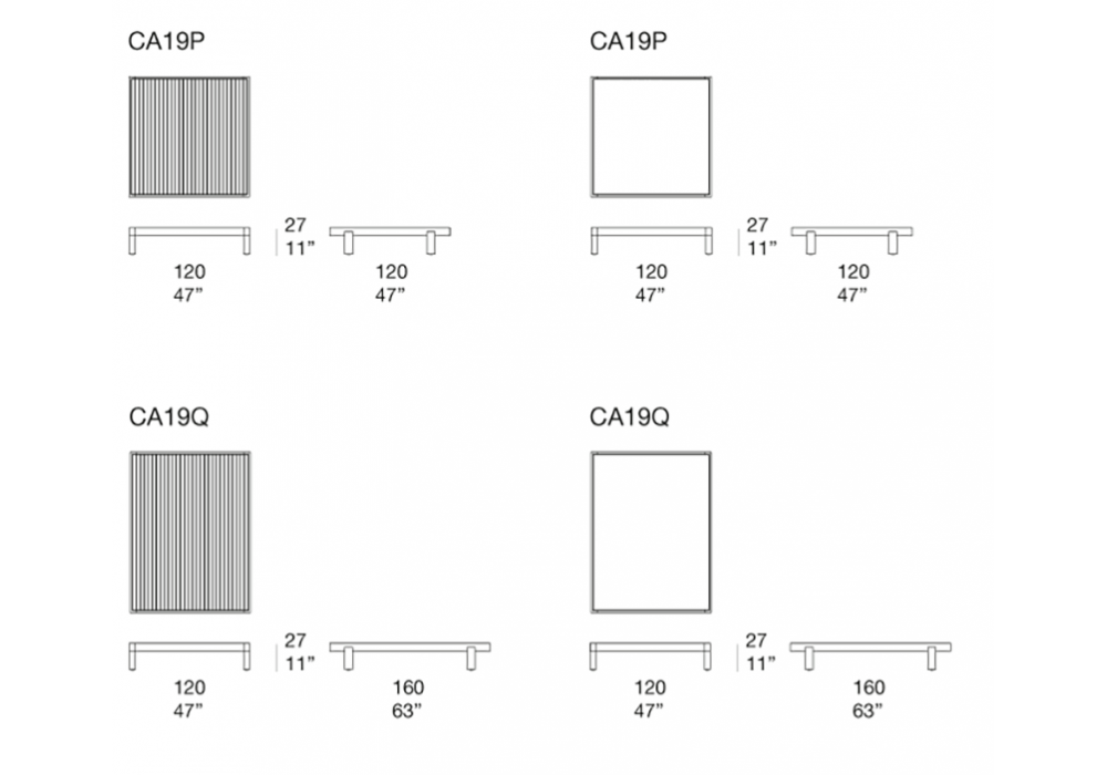 | Dimensions | 120 x 120 x H 27 cm; 120 x 160 x H 27 cm. |