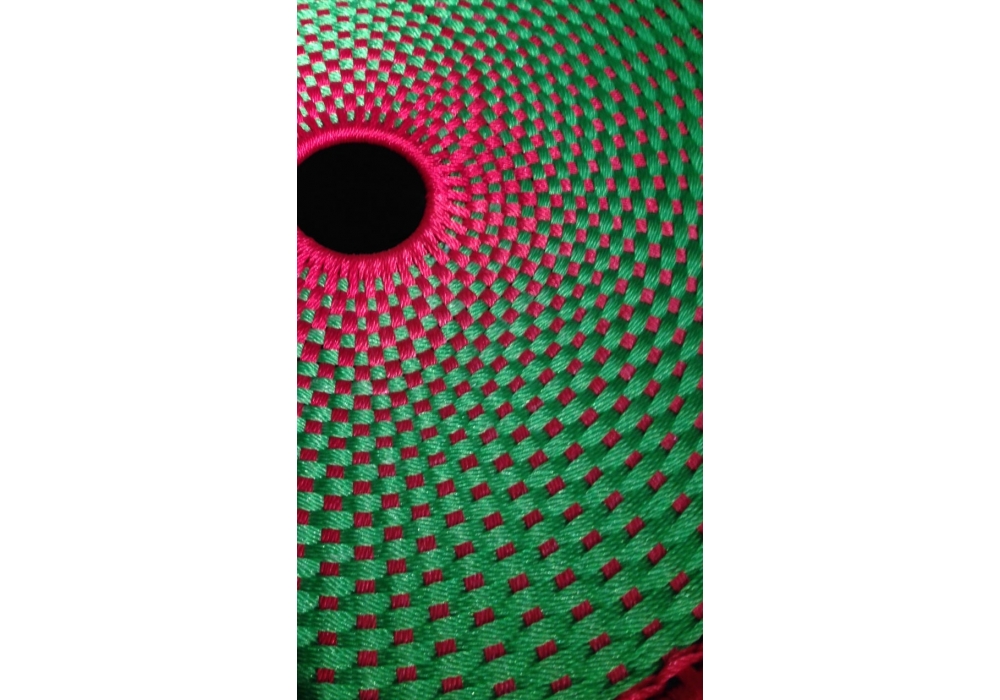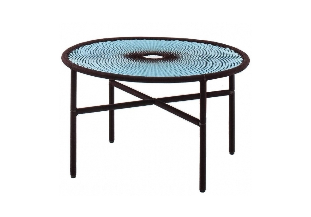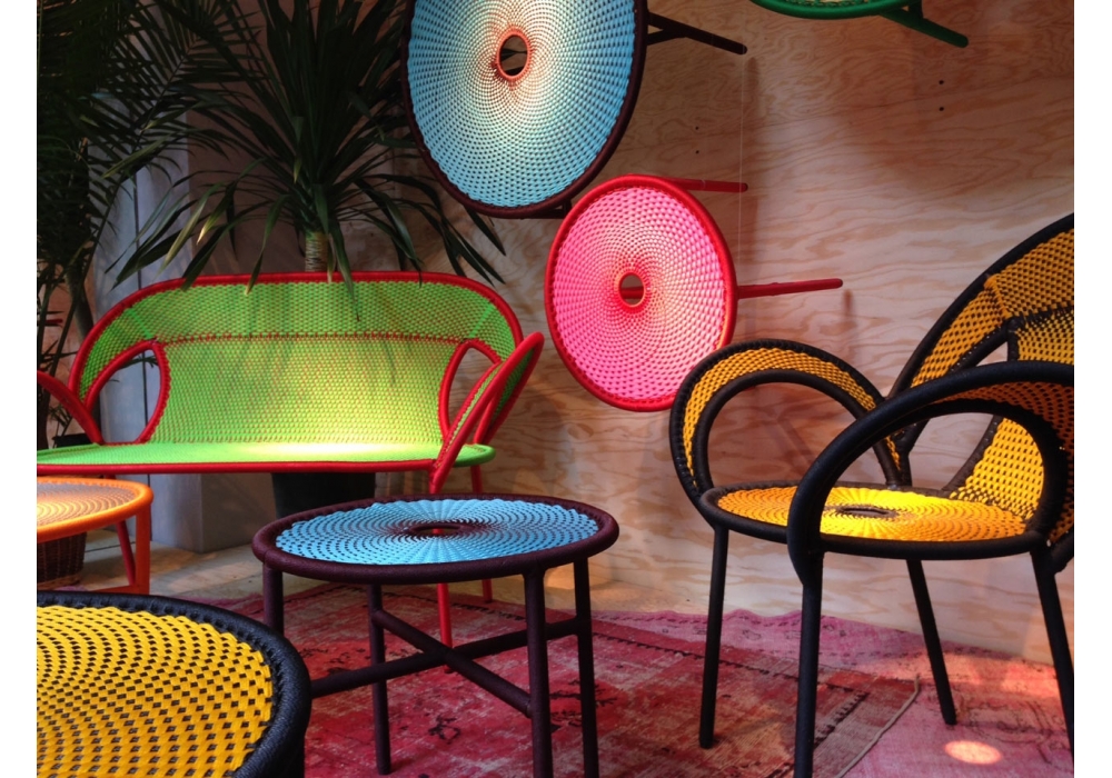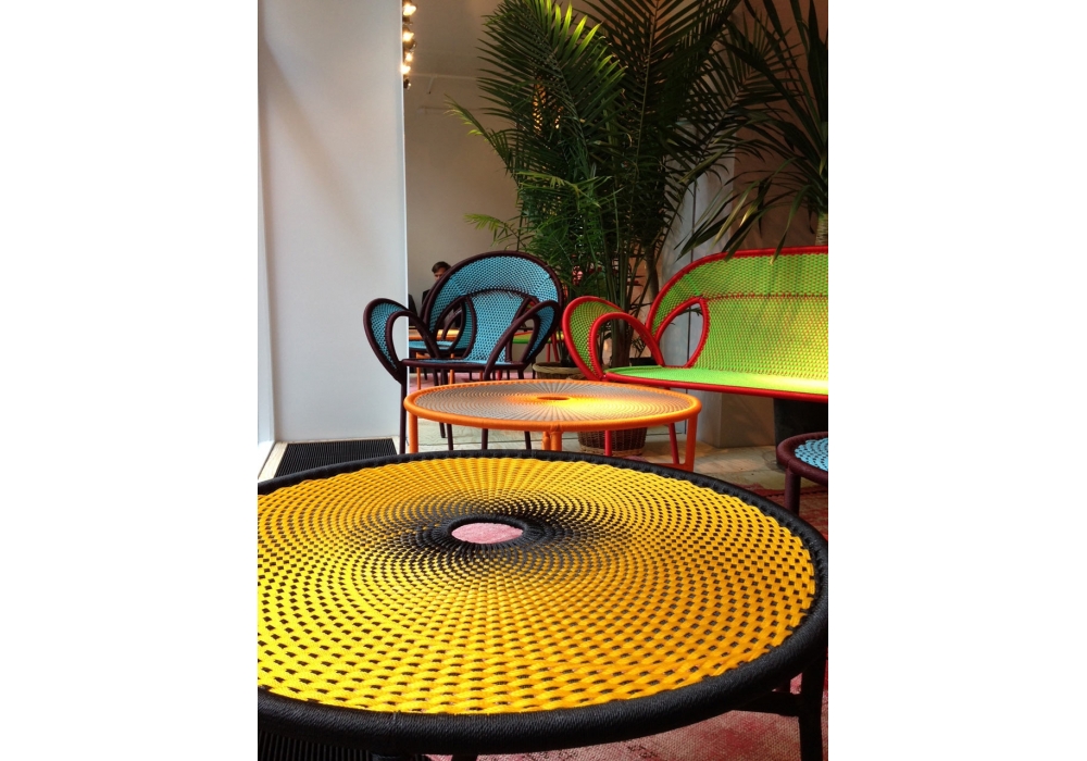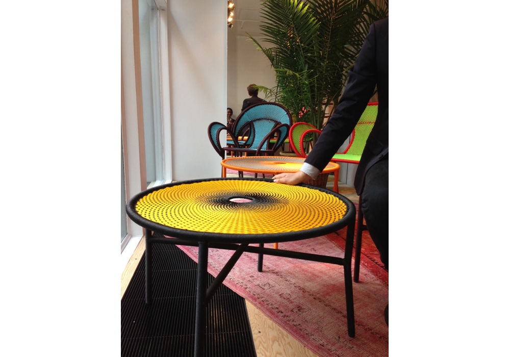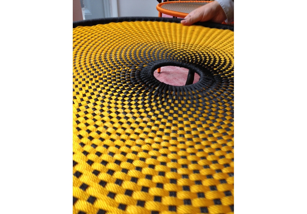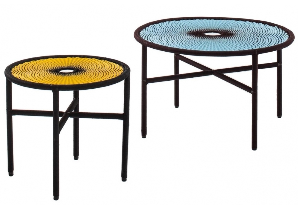 Banjooli conçue par Sebastian Herkner pour Moroso est une table basse en acier peint et fils de polyéthylène colorés tissés à la main. Semelles intérieures en PVC. Convient également pour l'extérieur.