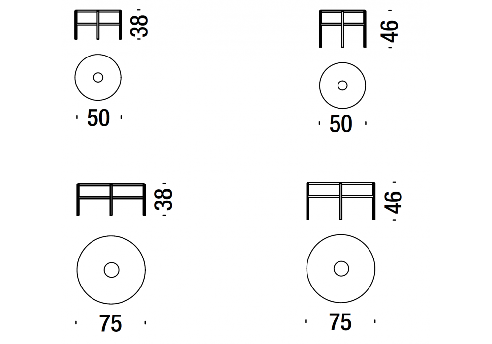 | Dimensions | Ø 50 x H 38 cm; Ø 50 x H 46 cm; Ø 75 x H 38 cm; Ø 75 x H 46 cm. |