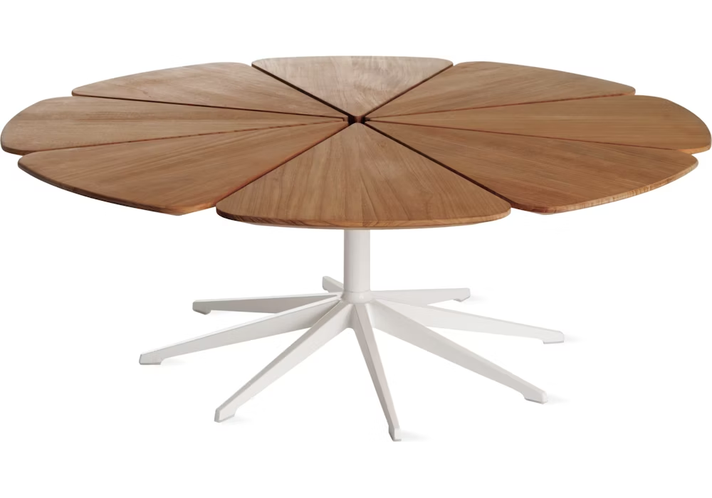 Petal, conçue par Richard Shultz pour Knoll, est une table basse d'extérieur avec structure en aluminium moulé sous pression peint par poudrage blanc et pied central en acier inoxydable peint. Plateau en polyuréthane haute densité blanc ou en teck.