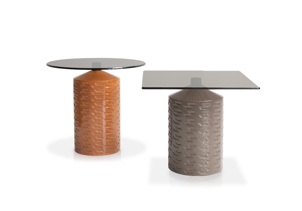 Hishi conçue par Chiara Andreatti pour Potocco est une table basse avec une base en céramique émaillée caractérisée par une décoration artisanale en bas-relief en maille géométrique. Le plateau circulaire ou carré est en verre trempé bronze. Convient également pour une utilisation en extérieur.