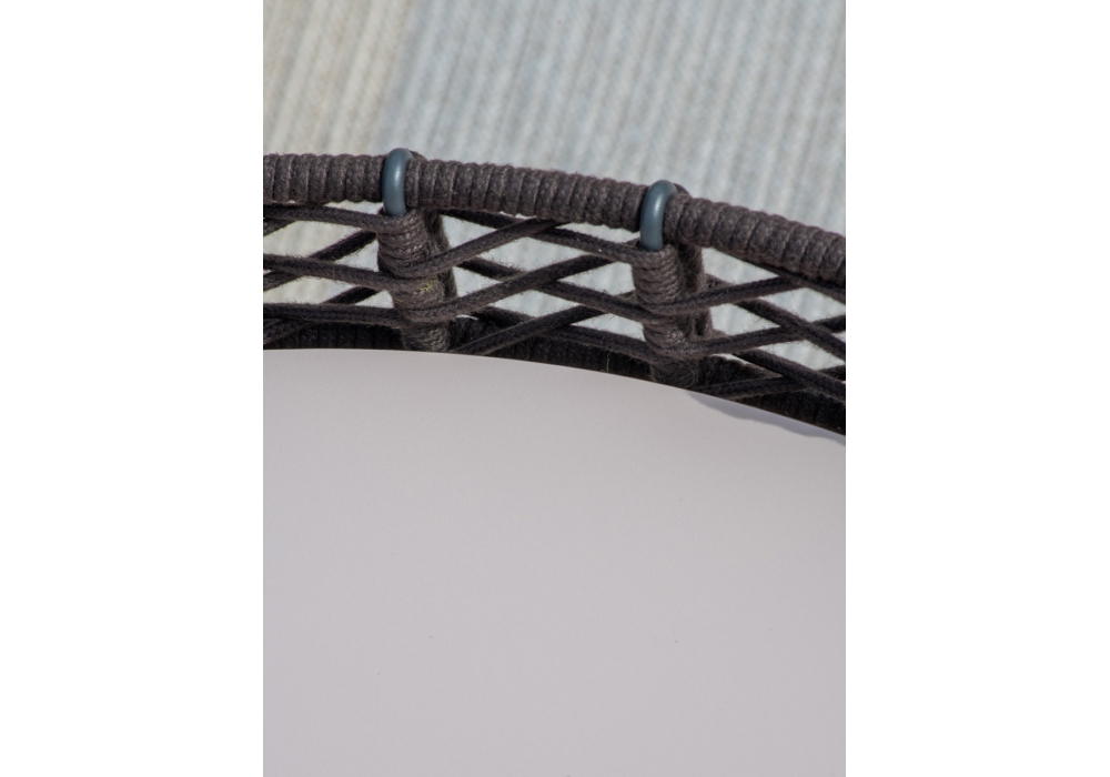Ropu Outdoor conçue par Chiara Andreatti pour Potocco est une table basse d'extérieur avec base en métal peint anthracite gaufré et structure avec cordon tissé "Gassa" marron foncé. Plateau en HPL anthracite ou grès oxyde noir.