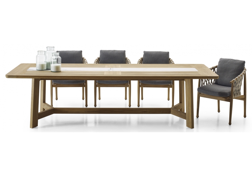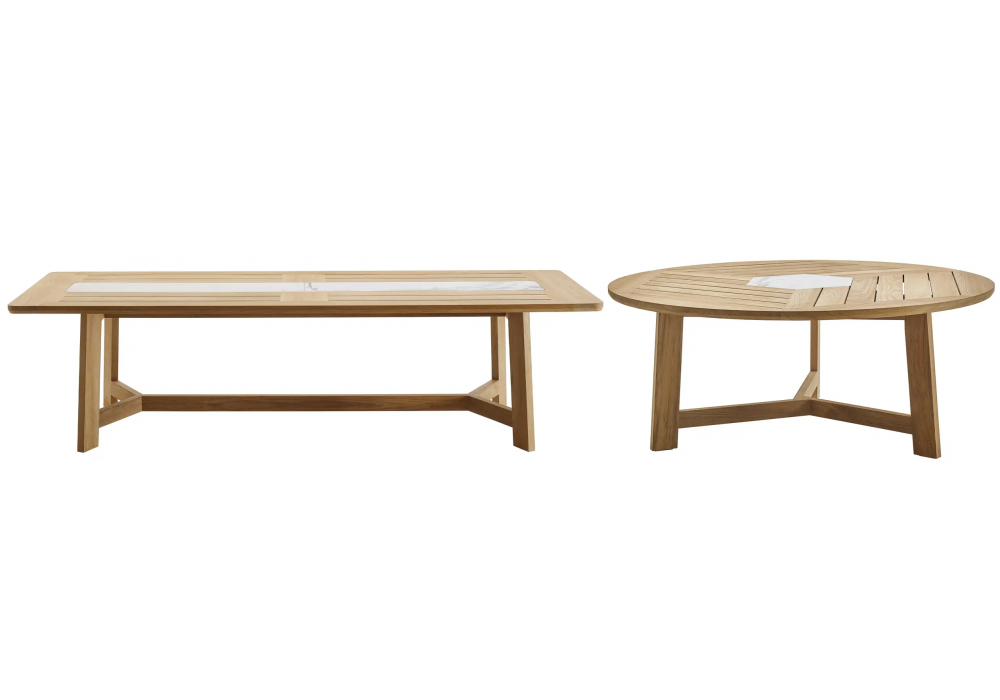 Ginestra conçue par Antonio Citterio pour B&B Italia Outdoor est une table avec structure en bois de teck et plateau avec insert décoratif en grès cérame blanc Calacatta. Disponible également en 3 dimensions différentes.