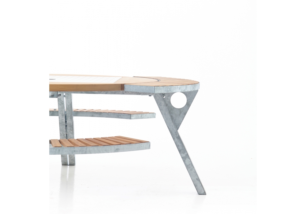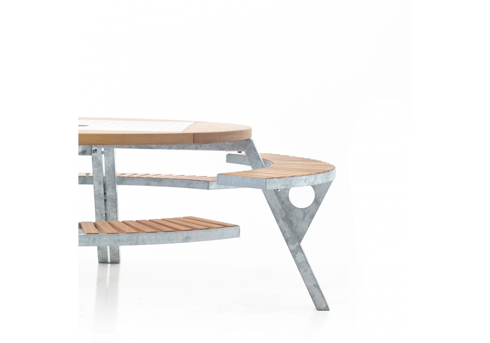 Gargantua conçu par Dirk Wynants pour Extremis est une table avec structure en acier galvanisé et plateau en bois iroko. La table Gargantua offre une fonctionnalité supérieure grâce à ses banquettes réglables pouvant être modifiés en fonction de la situation sociale ou familiale.