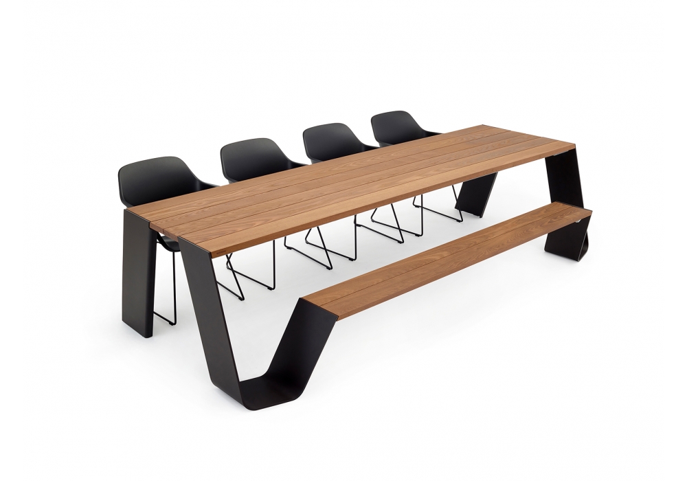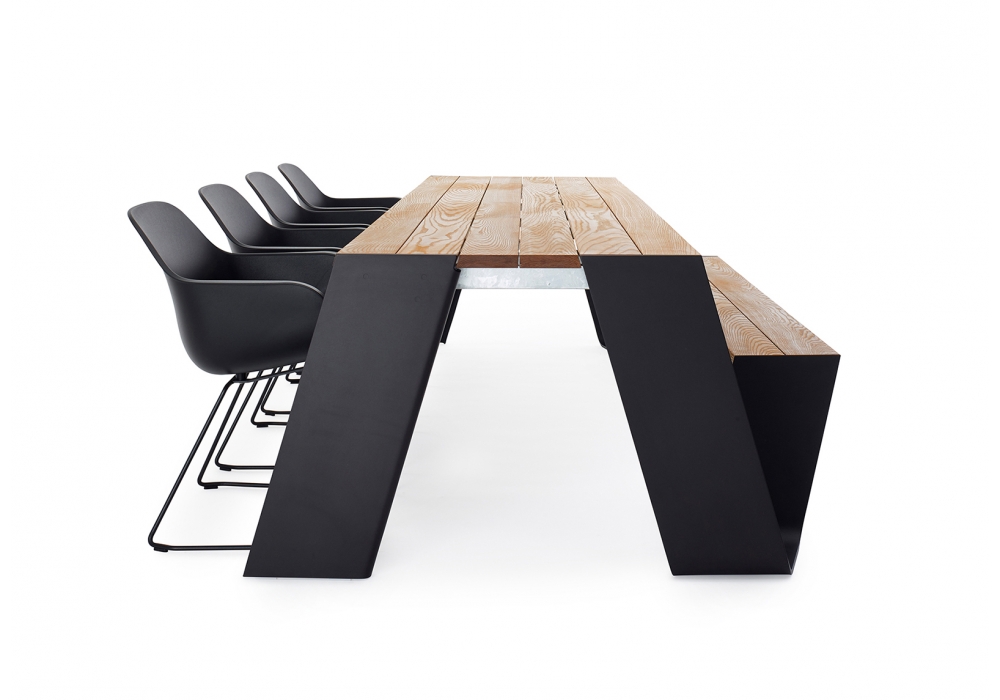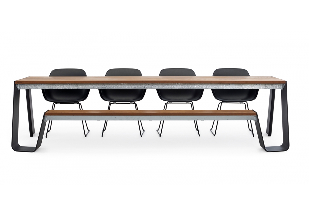 Hopper Combo conçu par Dirk Wynants pour Extremis est une table avec structure en métal et plateau en bois. Les deux points d'accès vous permettent de vous asseoir beaucoup plus élégamment. Désormais, vous pouvez choisir de remplacer un ou deux bancs par des chaises. Cette table est parfaite pour combiner avec "Hopper Shade". Disponible en différentes dimensions. Sur demande, le dossier et le parasol.