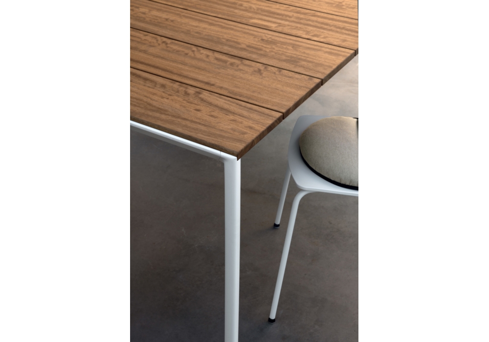 Maki Slatted conçue par Bartoli Design pour Kristalia est une table d'extérieur avec jambes en aluminium et plateau en bois. Disponible en différentes dimensions.
