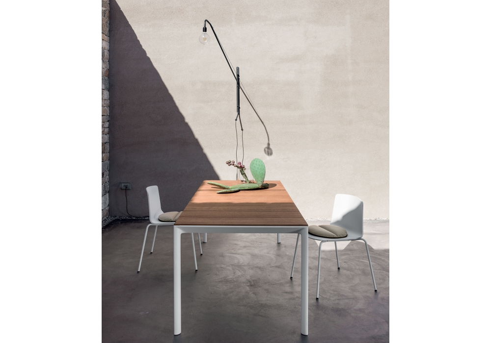 Maki Slatted conçue par Bartoli Design pour Kristalia est une table extensible d'extérieur avec jambes en aluminium et plateau en bois. Disponible en différentes dimensions. Extensions en la même finition de les jambes.
