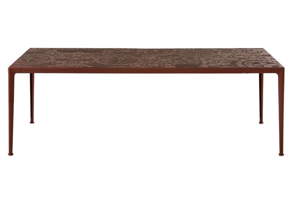 Mirto conçue par Antonio Citterio pour B&B Italia Outdoor est une table avec une structure en aluminium peint et un plateau en pierre de lave avec une décoration en différentes finitions.