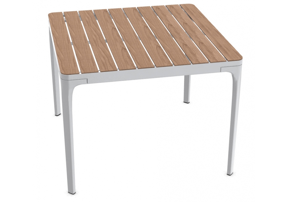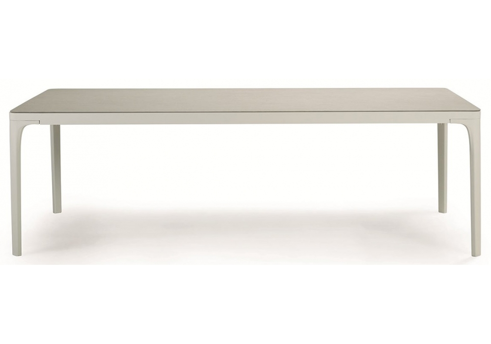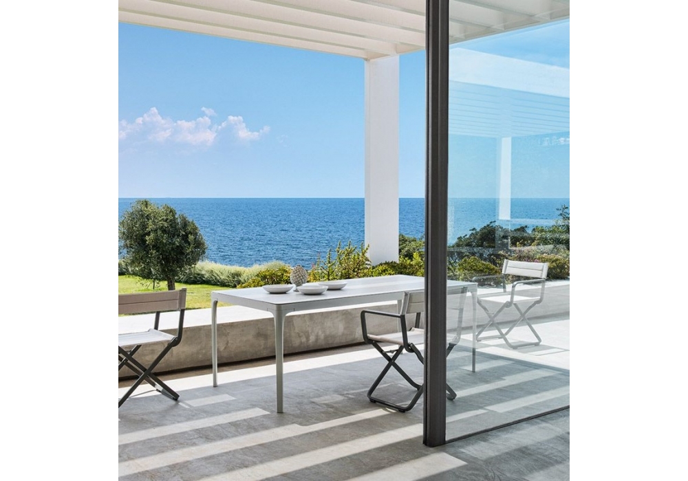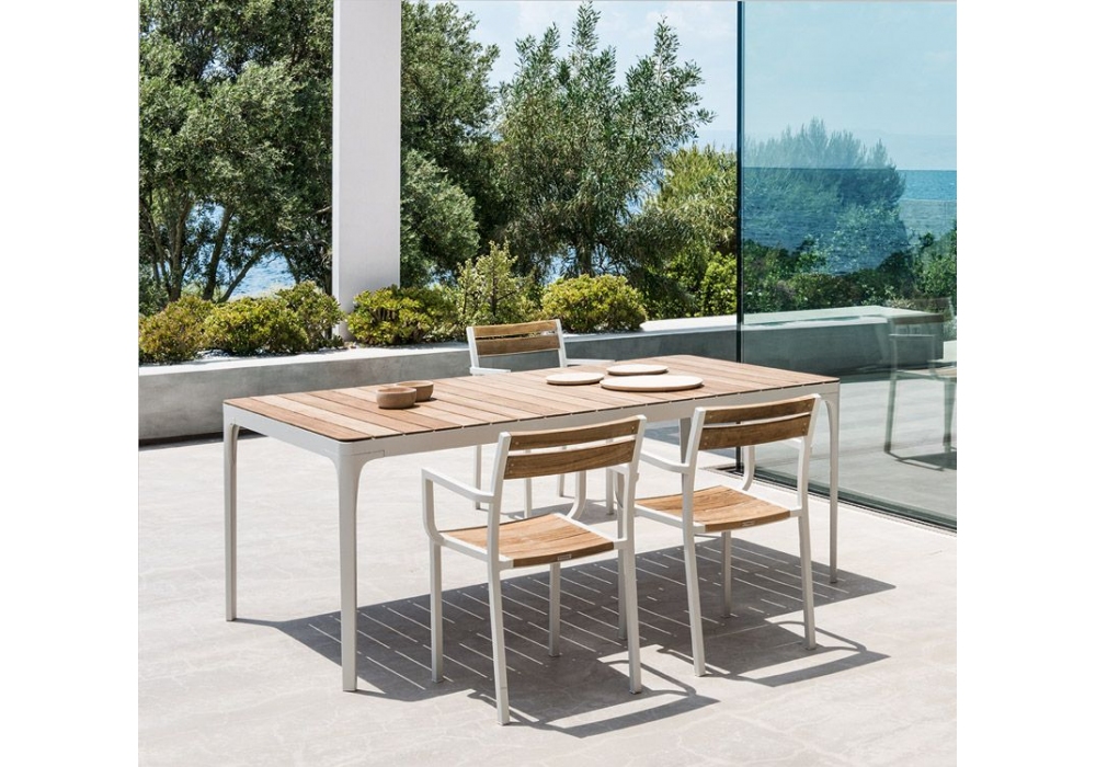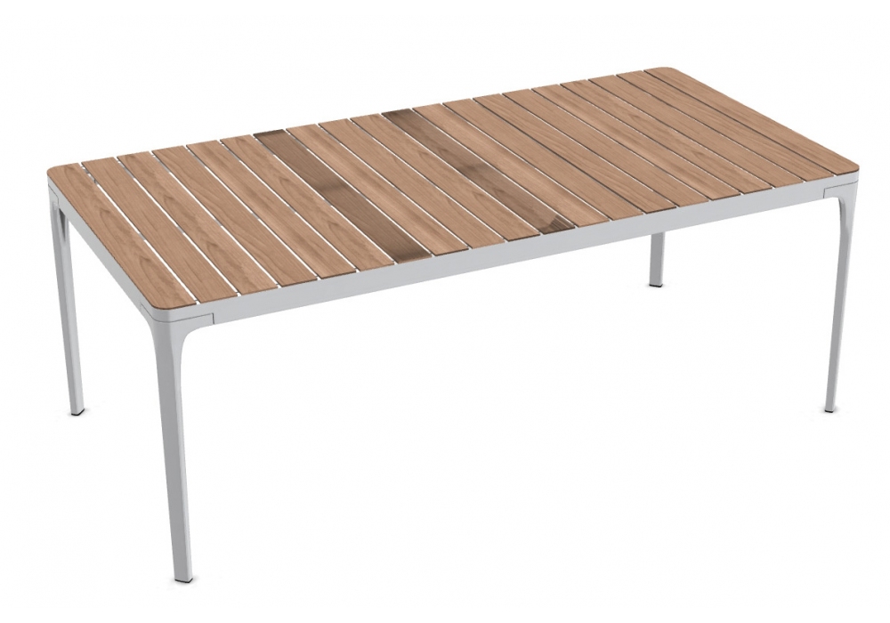 Play produite et conçue par Ethimo est une table à manger d'extérieur avec structure en aluminium peint et plateau en teck, aluminium ou pierre céramique. Play est disponible en différentes tailles et finitions.