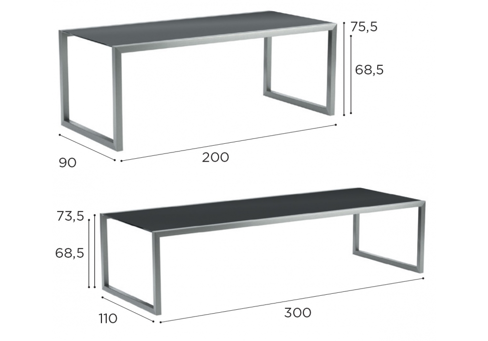 | Dimensions | 200 x 90 x H 75,5 cm; 300 x 110 x H 73,5 cm. |
