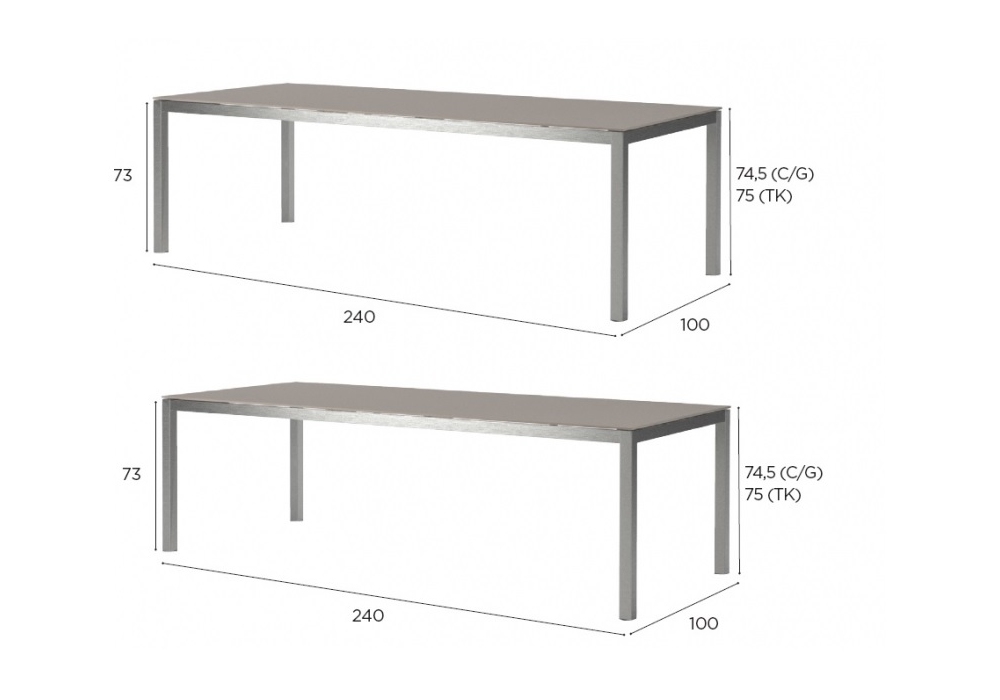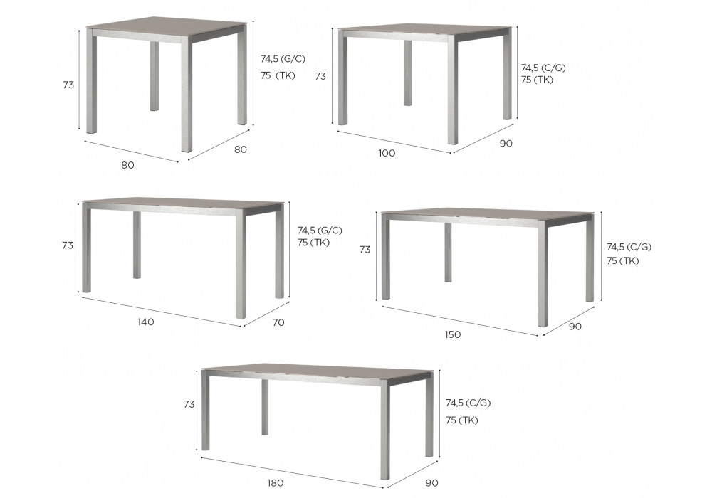 | Dimensions | - 80 x 80 x H 75 cm; - 90 x 100 x H 75 cm; - 140 x 70 x H 75 cm; - 150 x 90 x H 75 cm; - 180 x 90 x H 75 cm; - 240 x 100 x H 75 cm; - 300 x 100 x H 75 cm. |