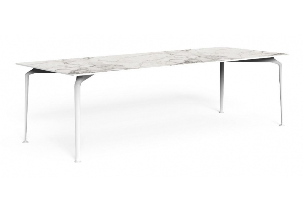 Cruise Alu conçue par Ludovica et Roberto Palomba pour Talenti est une table avec structure en aluminium en trois finitions, blanc, graphite ou vert aqua et plateau en grès dans la finition calacatta 12 mm. Disponible en trois tailles différentes.