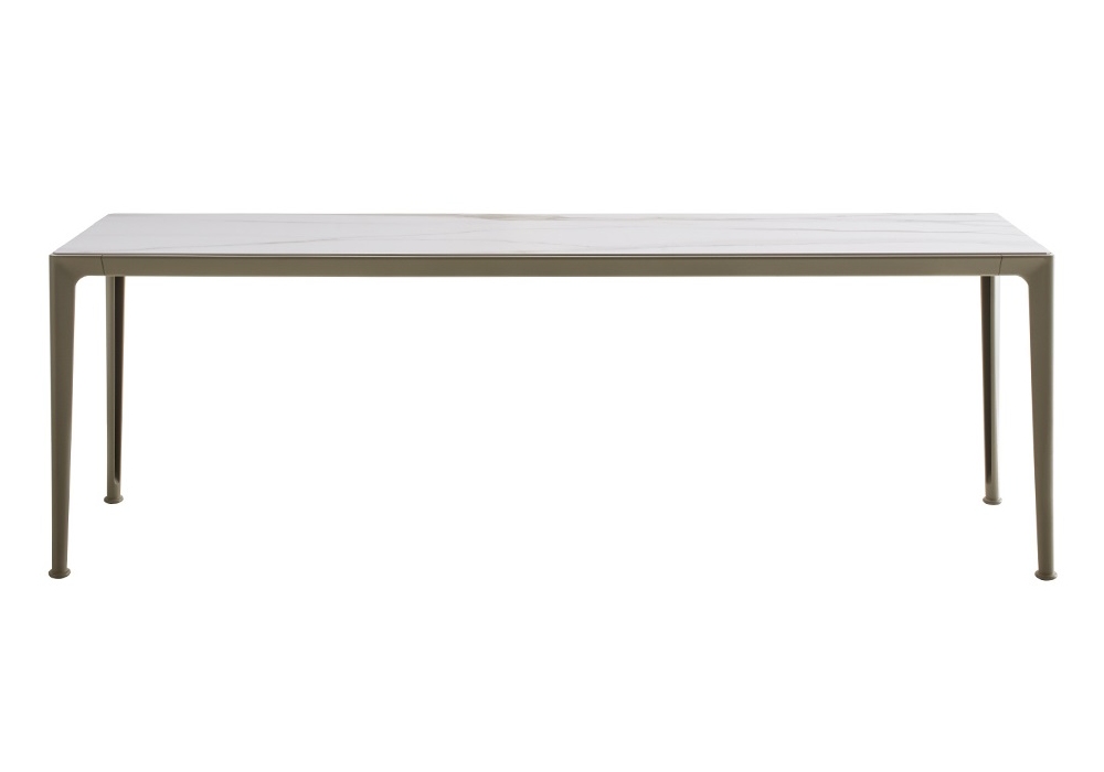 Mirto conçue par Antonio Citterio pour B&B Italia Outdoor est une table réalisée avec une structure en aluminium et un plateau en grès émaillé. Disponible en différentes dimensions.