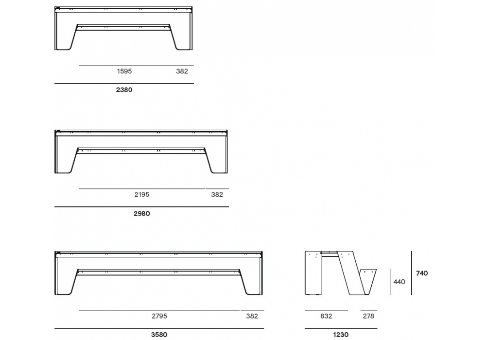 | Dimensions | 238 x 123 x H 74 cm; 298 x 123 x H 74 cm; 358 x 123 x H 74 cm. |