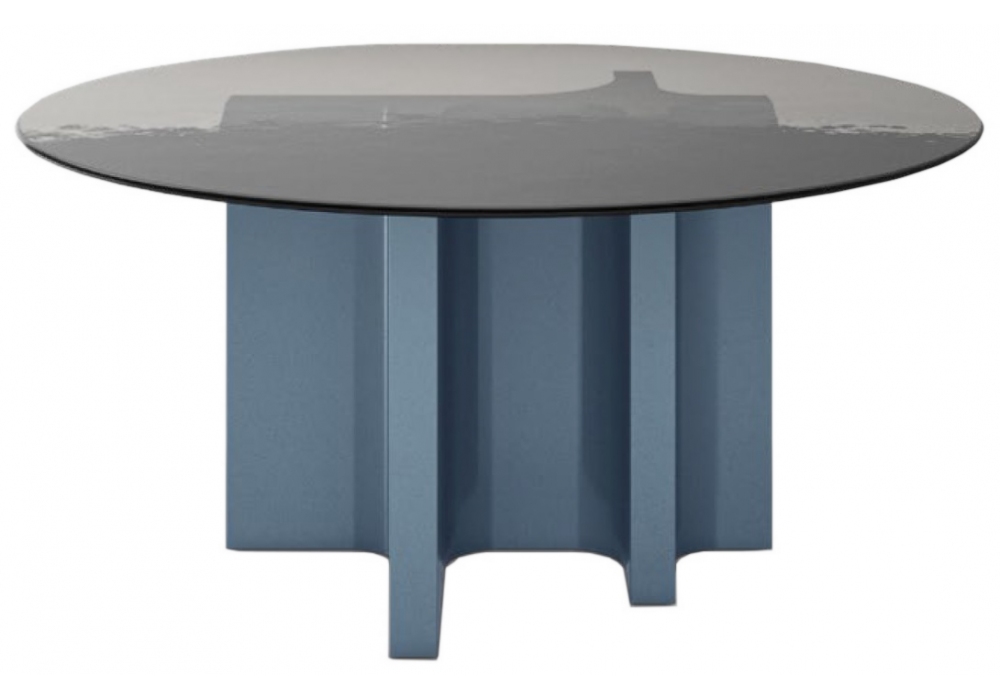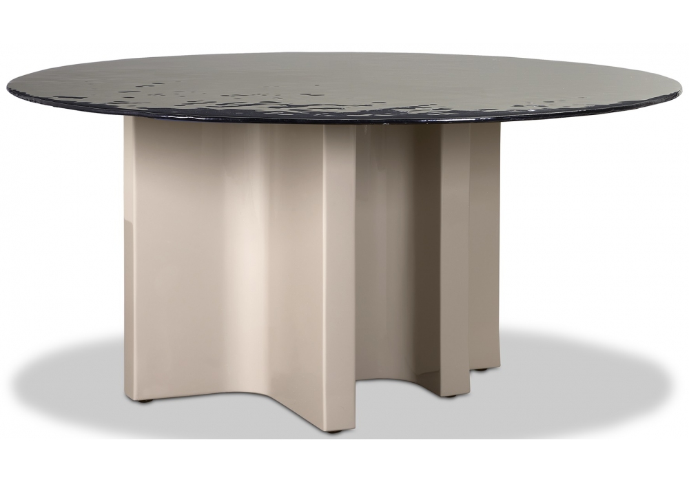 Dharma Outdoor conçue par Studiopepe pour Baxter est une table ronde avec base en polimex laqué brillant. Pieds réglables. Plateau en verre fusionné couleur bronze ou couleur fumée, réalisé avec une technique particulière visant à obtenir des surfaces imparfaites.