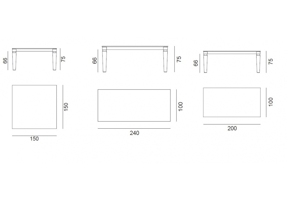 | Plateau | 150 x 150 cm; 240 x 100 cm; 200 x 100 cm. |