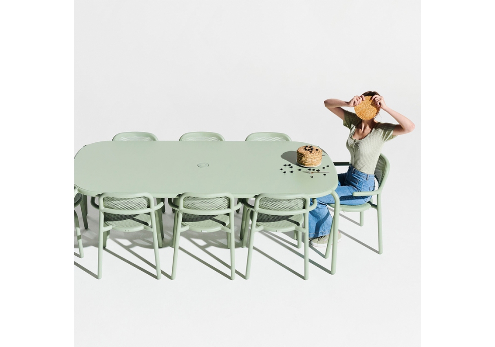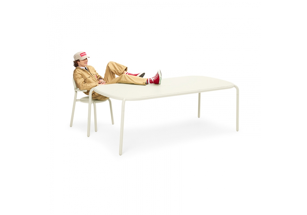 Toní Tablo conçue par Erik Stehmann by Fatboy est une table pouvant accueillir jusqu'à 8 personnes. L'aluminium rend la table belle et légère, de sorte qu'elle peut être déplacée facilement. Dans le trou central peut être inséré un parasol pour le jour et le chandelier pour le soir, résistant à la rouille et aux intempéries et sa couleur ne se décolore pas. Disponible en différentes finitions.