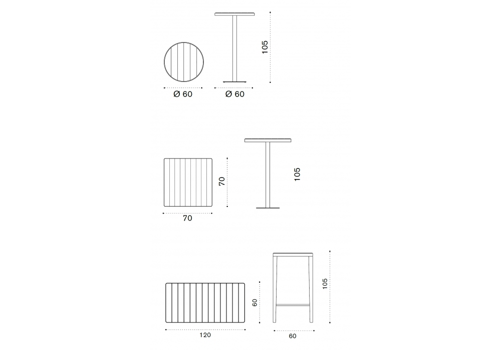 | Dimensions | 120 x 60 x H 105 cm; Ø 60 x H 105 cm; 70 x 70 x H 105 cm; |