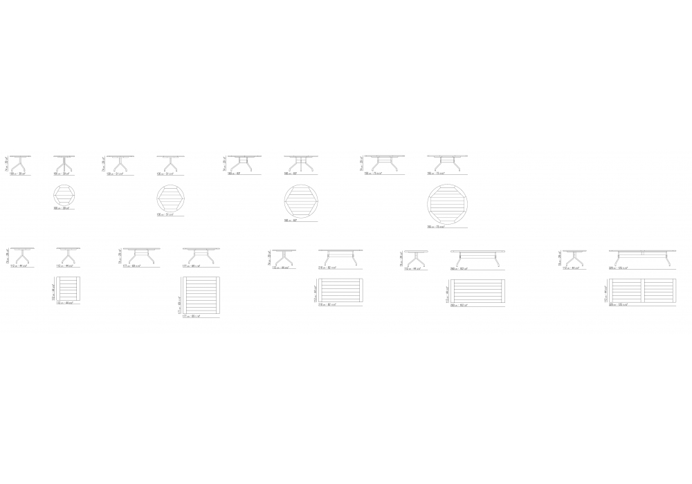 | Dimensions | • Ø 100 x H 74 cm; • Ø 130 x H 74 cm; • Ø 160 x H 74 cm; • Ø 193 x H 74 cm; • 112 x 112 x H 74 cm; • 177 x 177 x H 74 cm; • 210 x 112 x H 74 cm; • 260 x 112 x H 74 cm; • 320 x 112 x H 74 cm |
