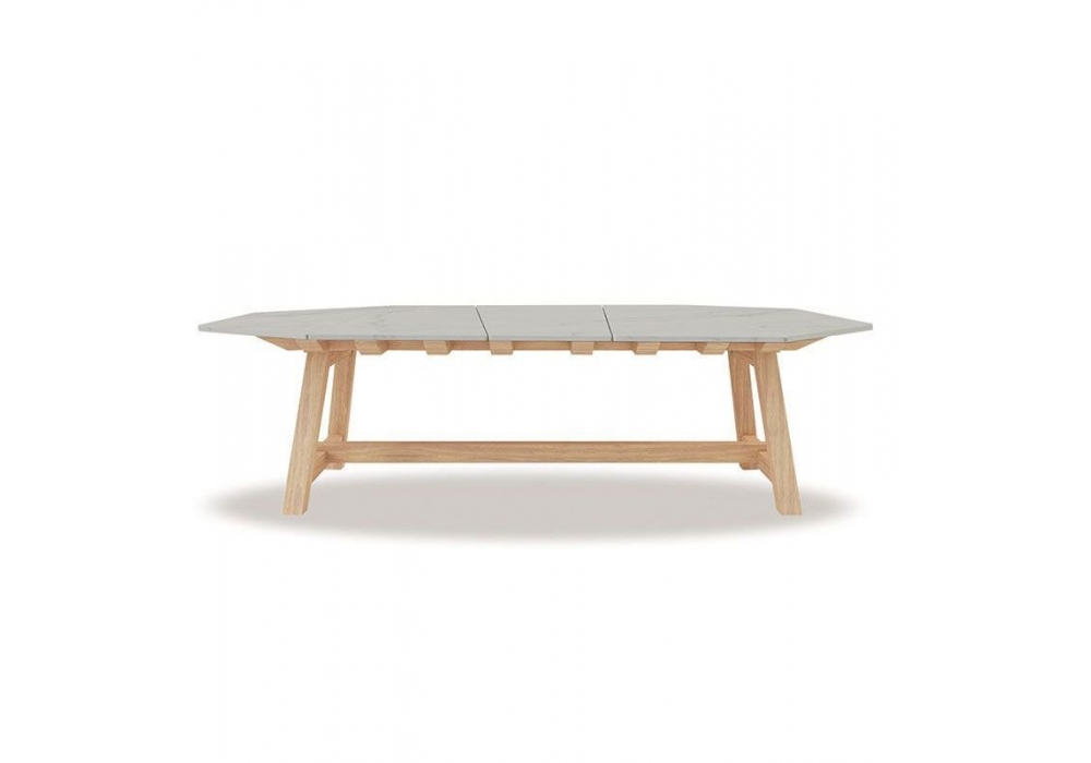 Rafael conçue par Paola Navone pour Ethimo est une table à manger d'extérieur avec structure en bois de teck et plateau en marbre ou pierre de lave. Rafael est disponible en différentes finitions et tailles.