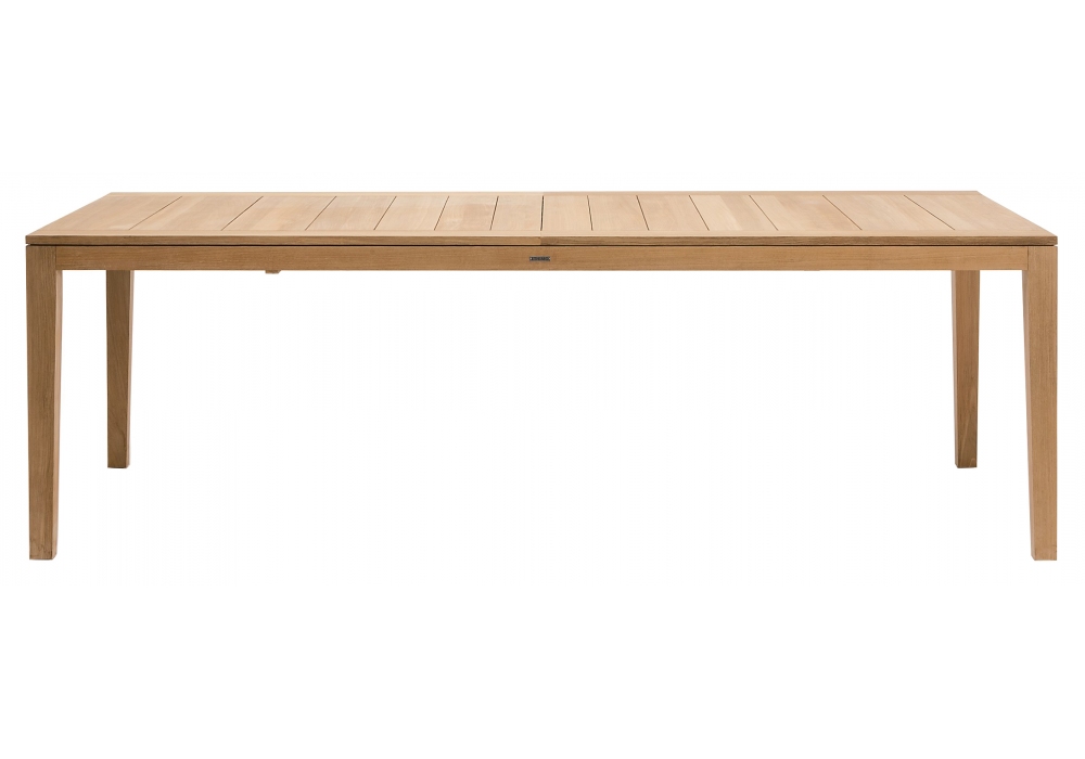 Ribot conçue par Marc Sadler pour Ethimo est une table à manger d'extérieur extensible de forme quadrangulaire entièrement structurée en bois de teck naturel.