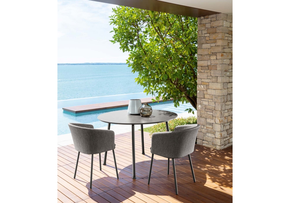 Slam conçue par Ludovica + Roberto Palomba pour Talenti est une collection de tables d'extérieur composée d'une base en aluminium et d'un plateau en grès.