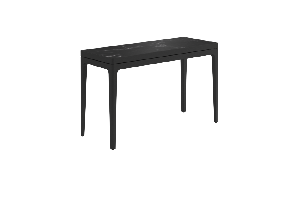 Grid Square conçue par Henrik Pedersen pour Gloster est une console d'extérieur avec structure en aluminium enduit de poudre et plateau en teck ou en céramique.