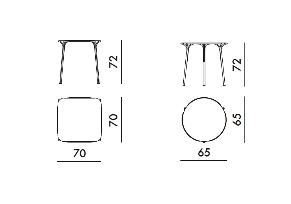 | Dimensions | Ø 65 x H 72 cm; 70 x 70 x H 72 cm. |