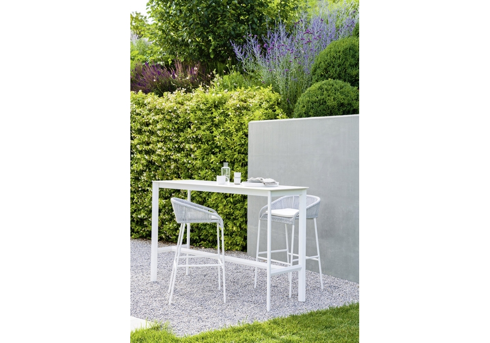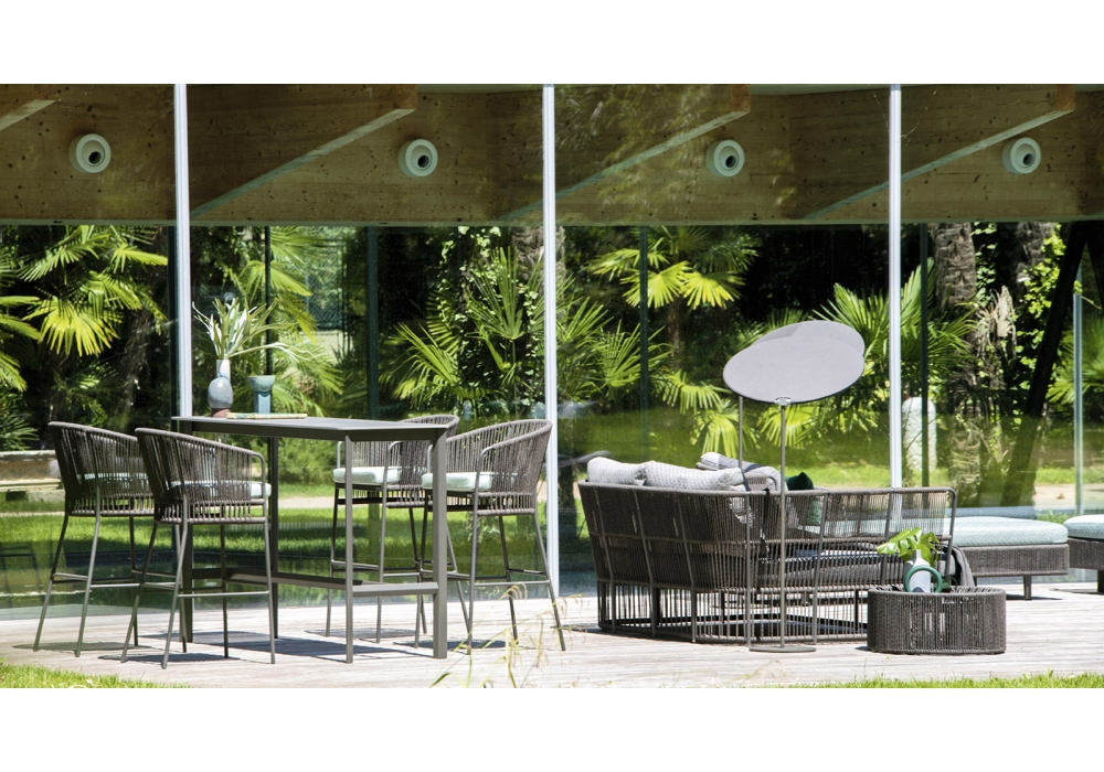 System conçu par Daniele Lo Scalzo Moscheri pour Varaschin est une table haute avec structure en aluminium thermolaqué et plateau en HPL ou en céramique. Disponible en différentes finitions.
