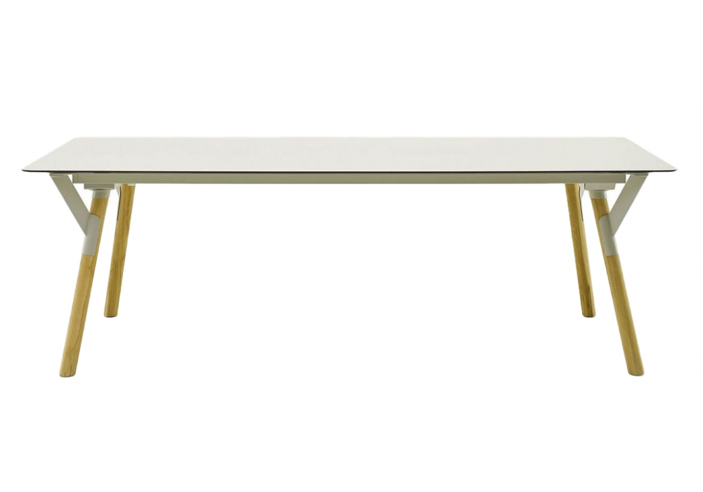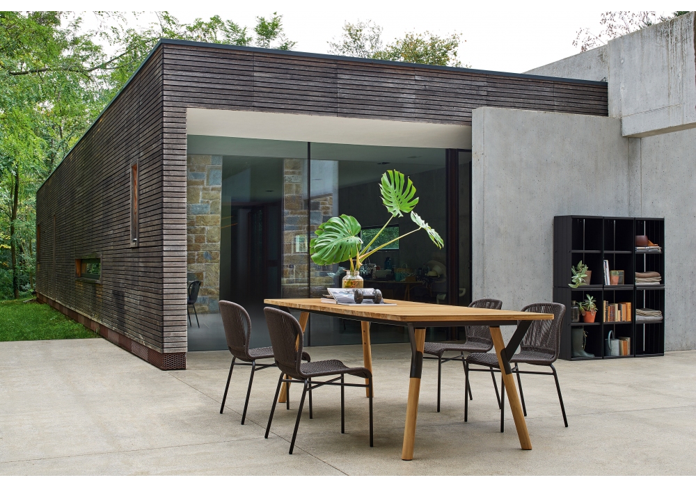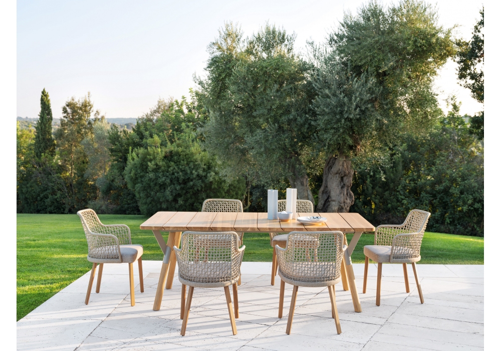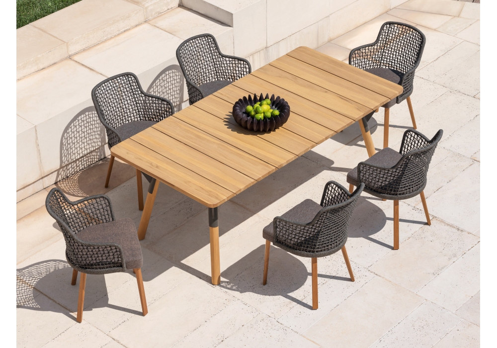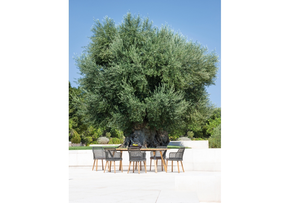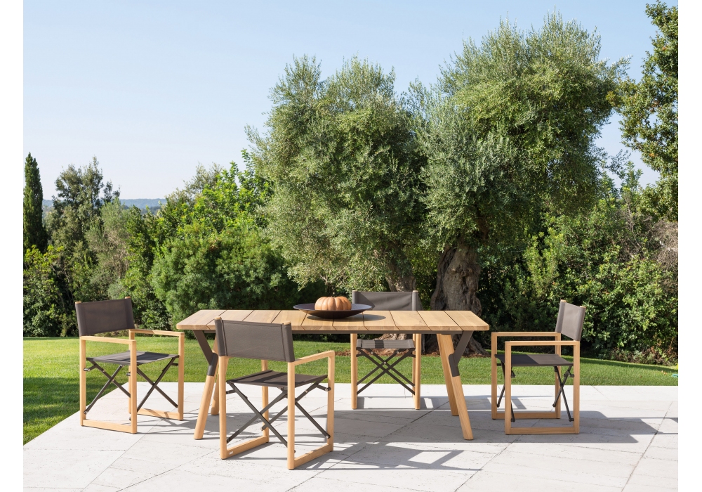 Link conçue par Alain Gilles pour Varaschin est une table avec structure en métal enduit de poudre. Pieds également disponibles en teck massif de plantation certifié. Les plateaux ronds, rectangulaires ou elliptiques peuvent être en Hpl, teck ou céramique. Disponible en différentes finitions et en différentes tailles.