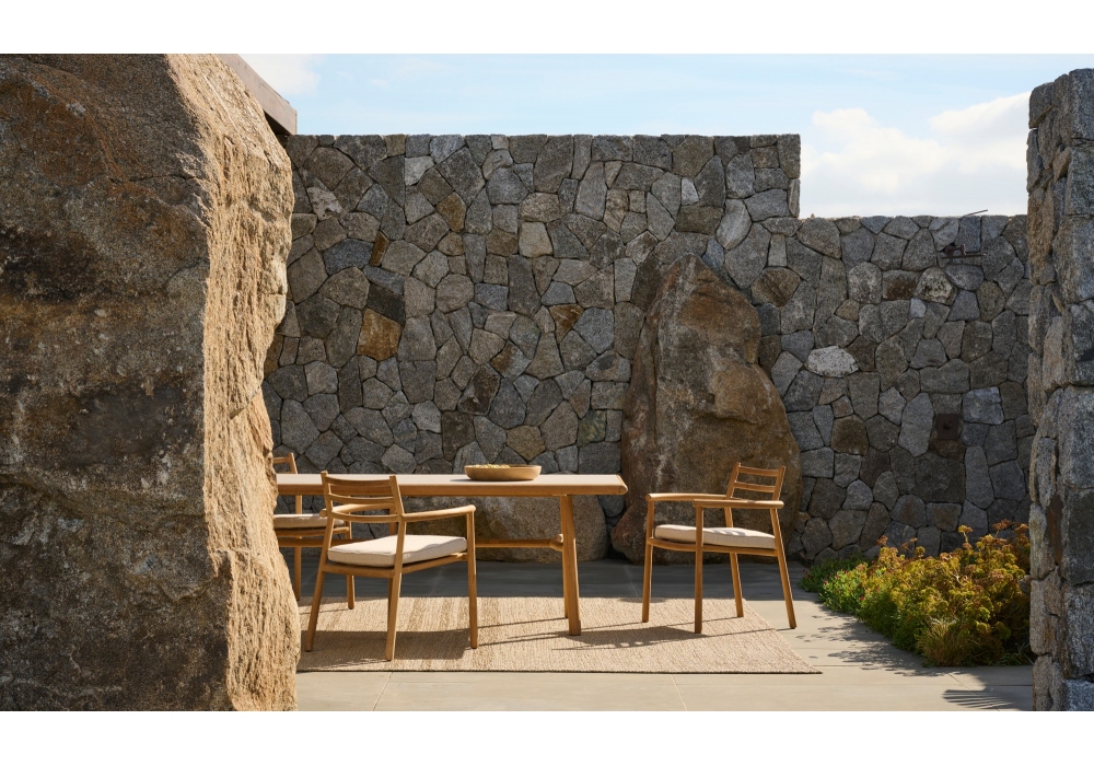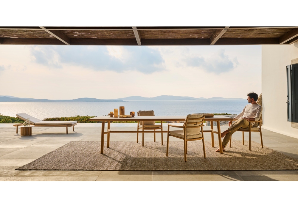 Ukiyo conçue par Monica Armani pour Tribù est une table à manger avec structure en teck et plateau superposé en céramique, disponible en différentes finitions.