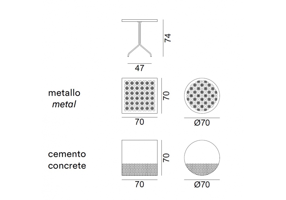 | Dimensions | 70 x 70 x H 74 cm; Ø 70 x H 74 cm. |