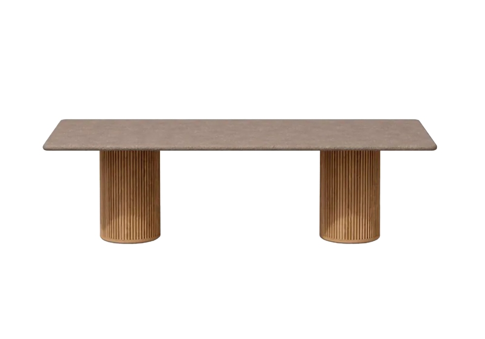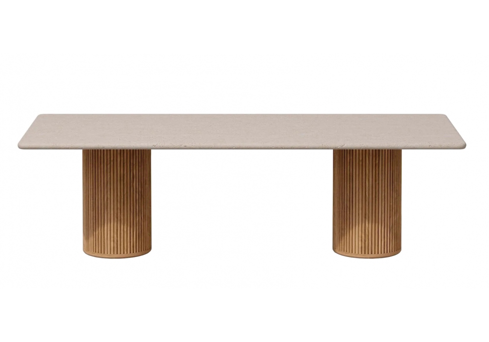 Otto conçue par Marc Merckx pour Tribù est une table avec une base structurée par deux pylônes cylindriques en bois de teck avec une surface striée. Le plateau est quadrangulaire en céramique et travertin granulé. Otto est disponible en différentes finitions et tailles.