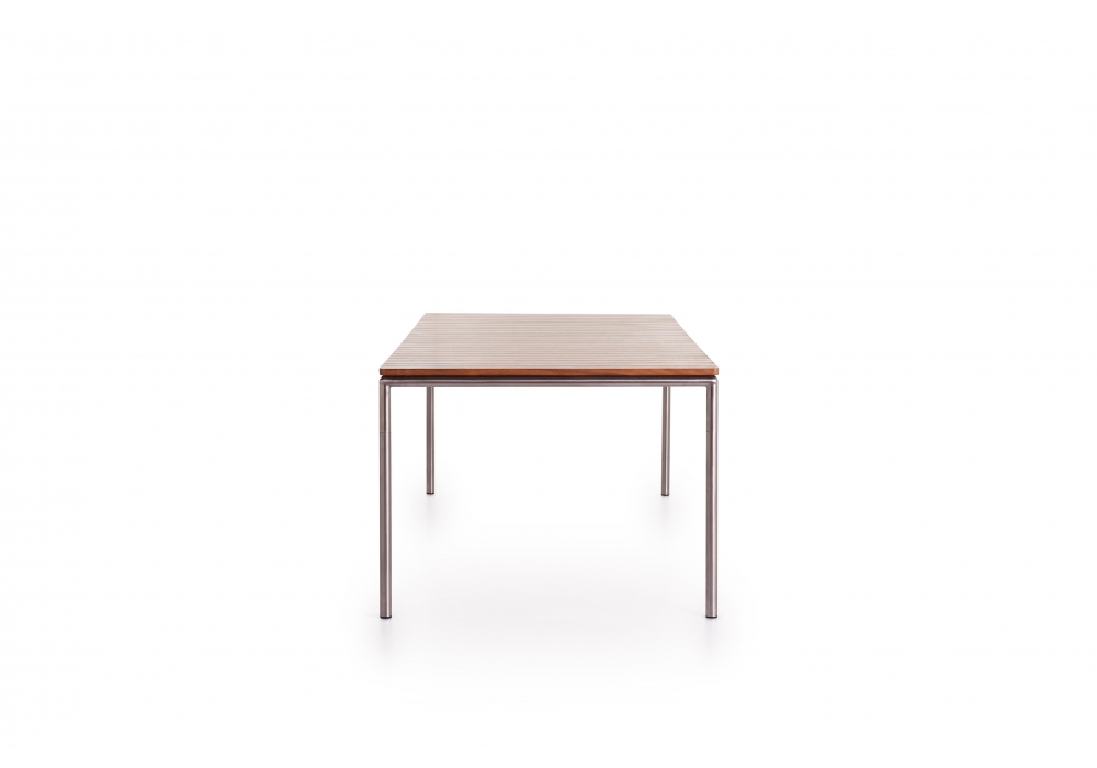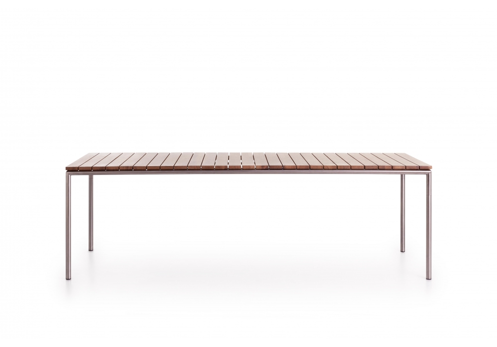 Table Onsen conçue par Francesco Meda et David Quincoces pour Gandia Blasco est composée de lattes en bois d'iroko et d'une structure continue et élégante en acier inoxydable, avec des pieds amovibles, pour un design minimaliste et polyvalent. Disponible en différentes finitions.