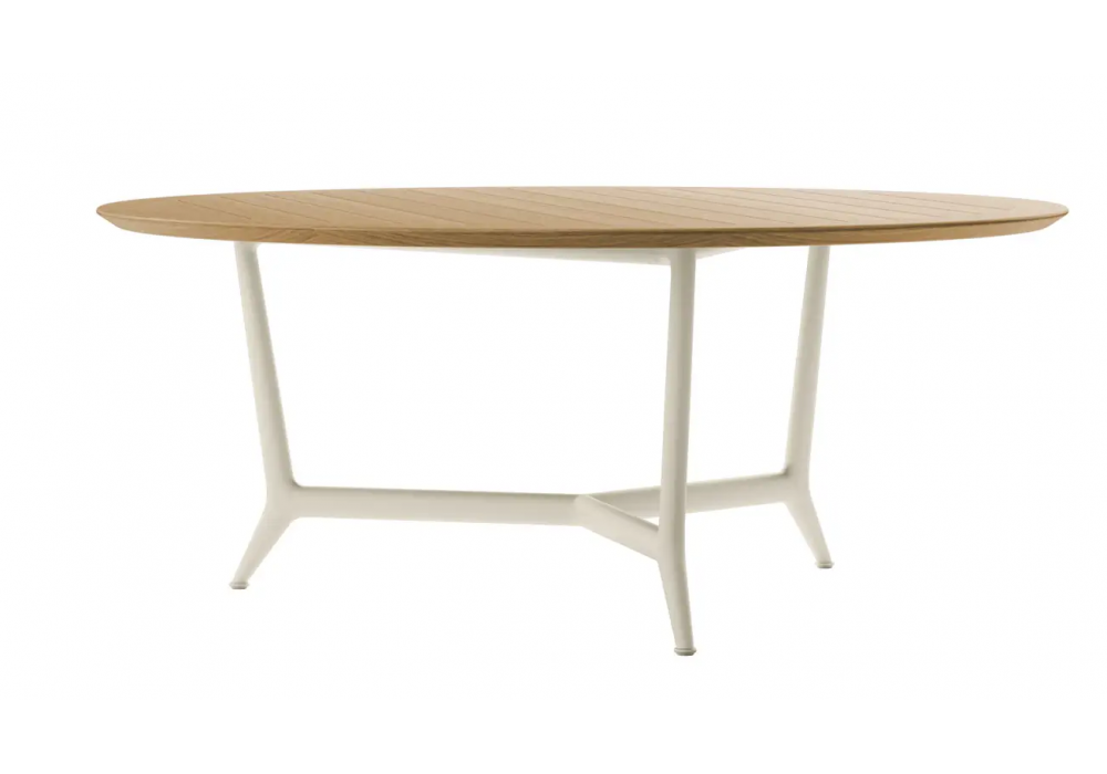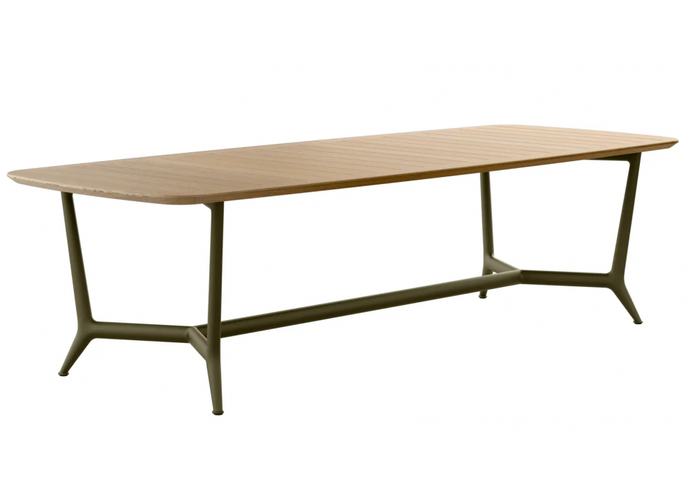 Erica conçue par Antonio Citterio pour B&B Italia Outdoor est une table d'extérieur avec une structure en aluminium peint en différentes finitions et un plateau en teck naturel.