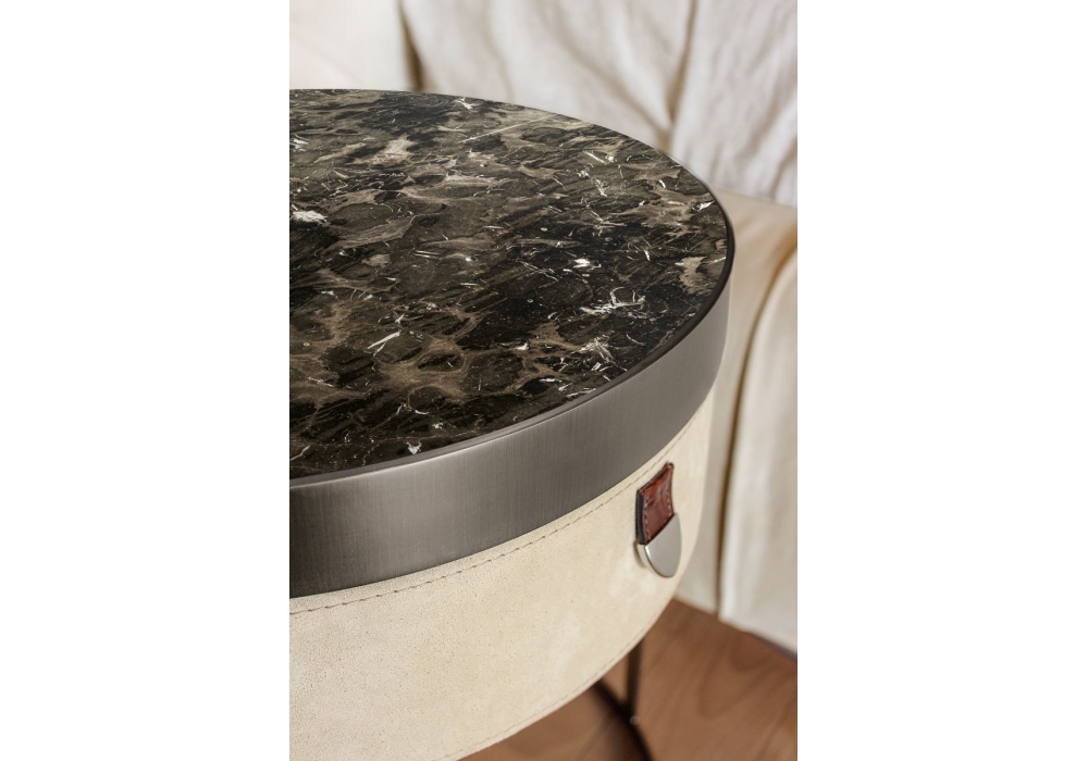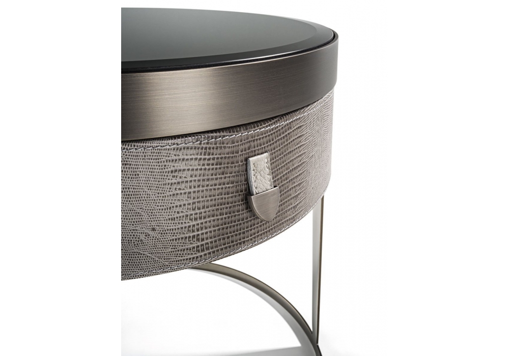 Amadeus conçue par Giuseppe Viganò pour Longhi est une table de chevet avec 1 tiroir tapissé en cuir, structure d'acier et plateau disponible en plusieurs finitions.