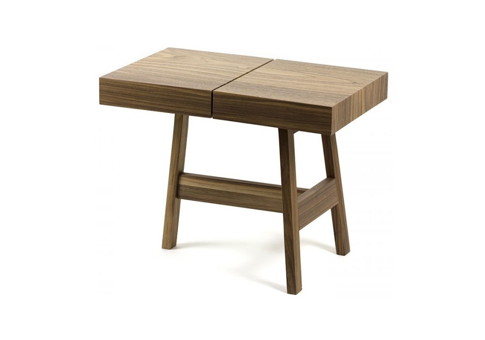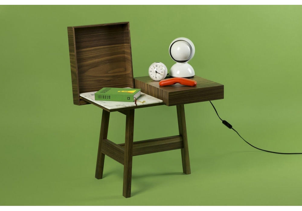 Noci conçu par Lucidi Pevere pour InternoItaliano est une table de chevet en noyer canaletto avec un plateau composé d'une partie qui se soulève grâce à charnières en laiton révélateur un plateau en marbre blanc de Carrara, et une seconde partie qui agit comme une surface d'appui.